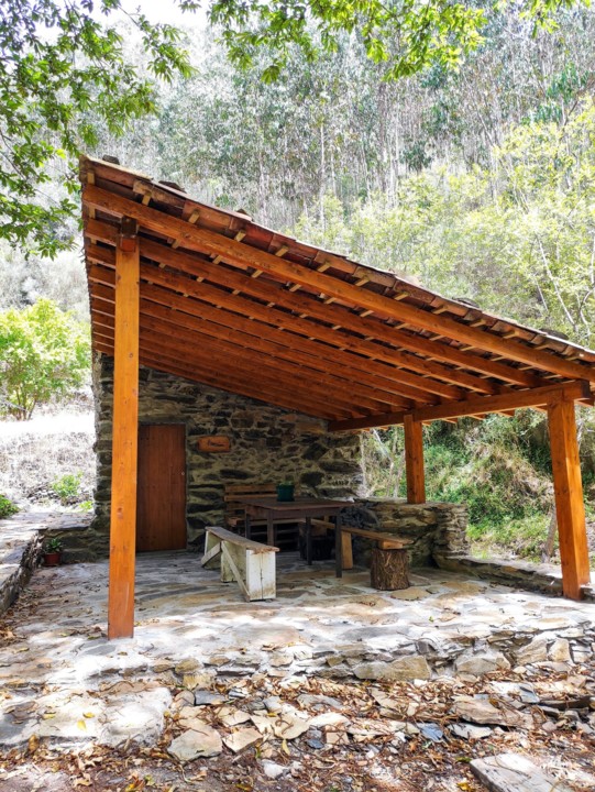 A meio caminho tem uma zona de lazer com mesas de merenda, churrasqueira, um baloiço, jogos tradicionais e um escorrega apontada para a ribeira.