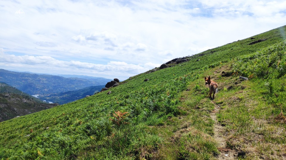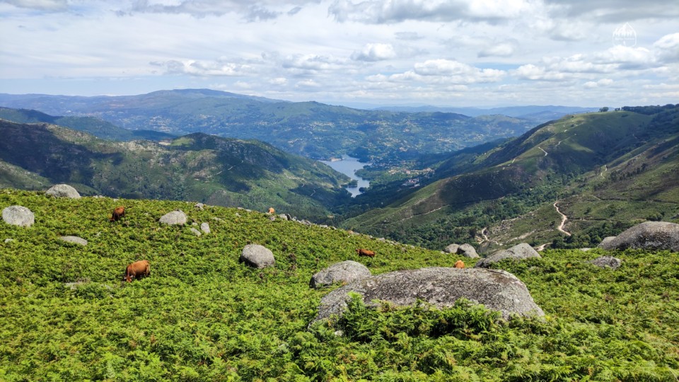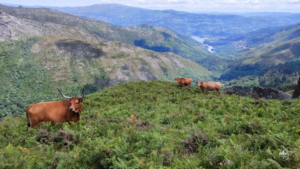 Depois da subida o caminho segue mais plano para desfrutar da vista sobre o rio Caldo. Neste local ainda apanhamos um grupo de vaquinhas passando pelo meio delas.