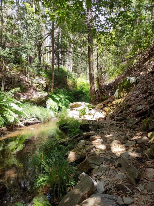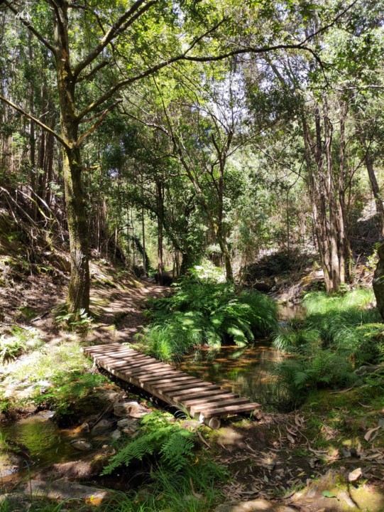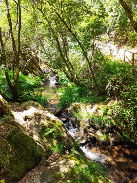 O percurso prossegue junto à ribeira onde o som da água é uma constante e o cântico das aves é alto.
