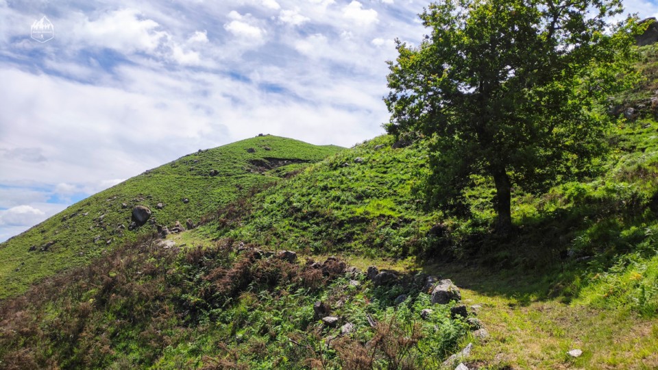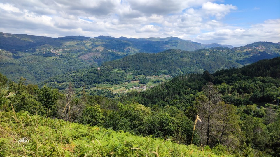 Seguimos continuando a descer durante 1,5km por entre carreiros mais estreitos ou caminhos de terra batida sempre com uma paisagem bonita sobre os montes verdejantes.