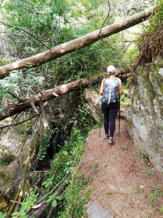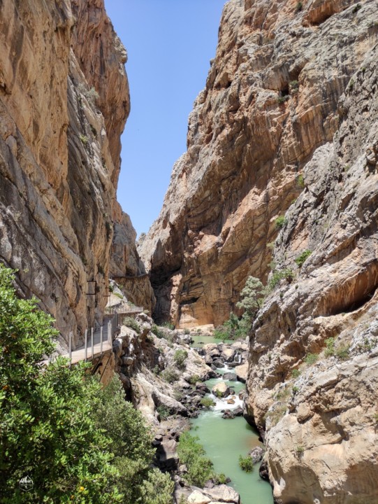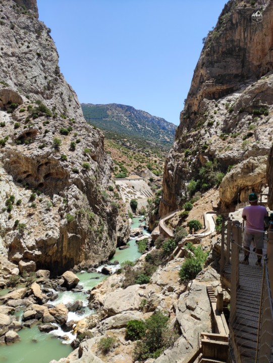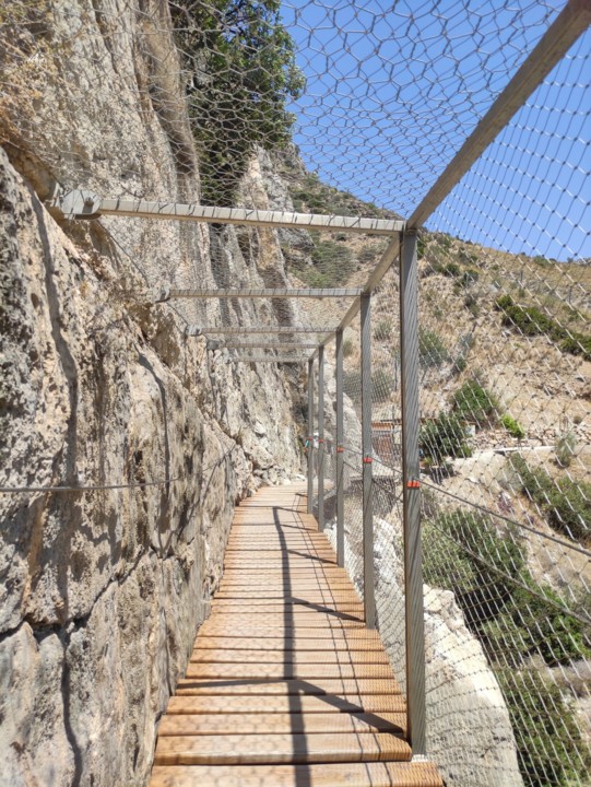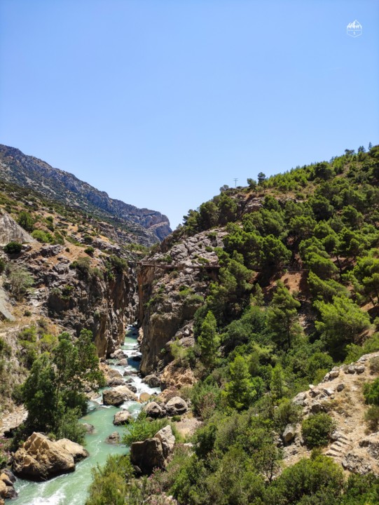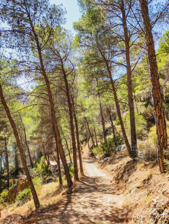 Durante os primeiros 2,7km o caminho segue em terra batida percorrendo um bosque de pinheiros e certas partes do trilho vamos vendo paisagem sobre o rio Guadalhorce e para o desfiladeiro mais ao fundo.