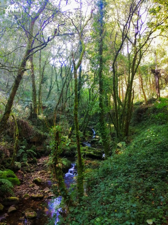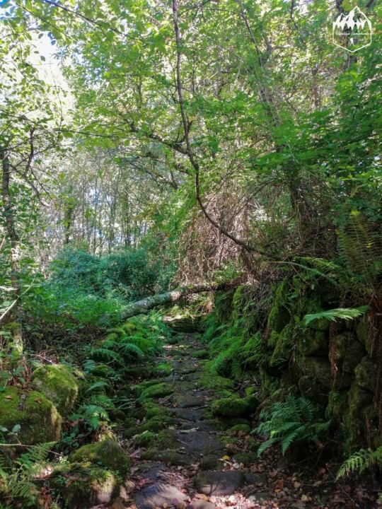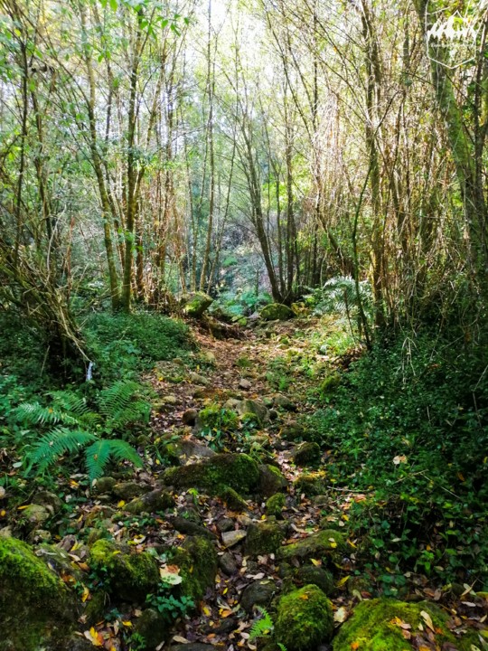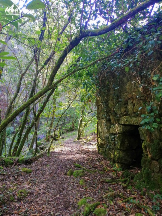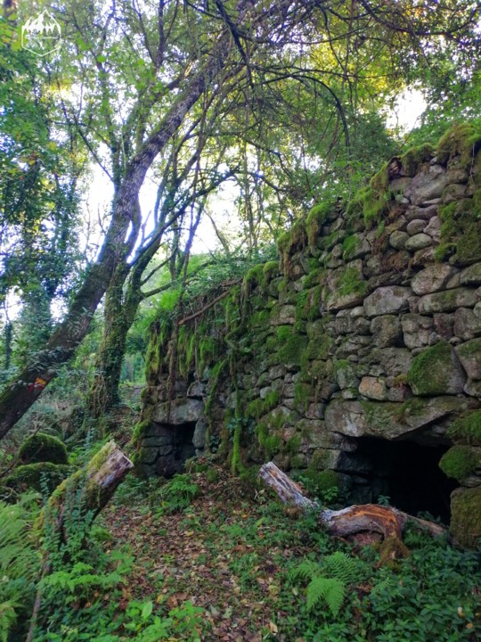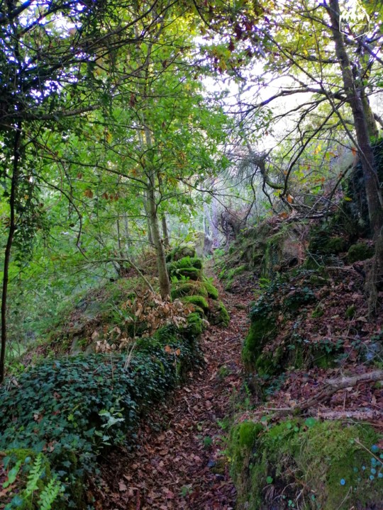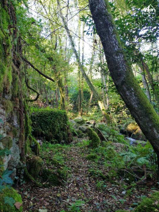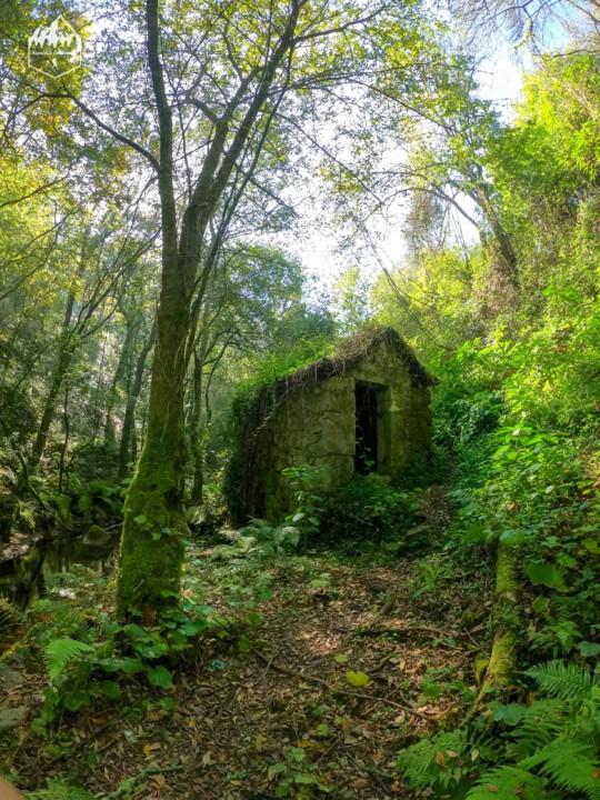 Estamos perto do rio, o som da água está cada vez mais perto e a natureza cobre-nos cada vez mais. Chegamos a uma ruína coberta de musgo, talvez uma casa? Se fosse moinho estaria mais junto à linha do rio, mas este edifício está mais afastado.