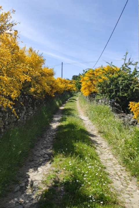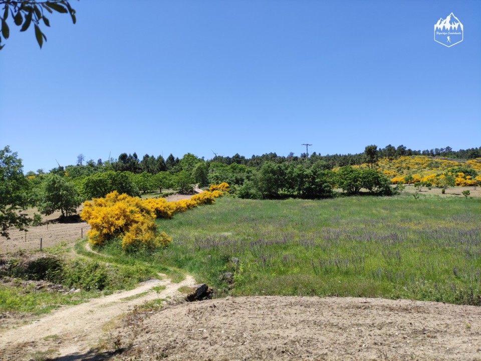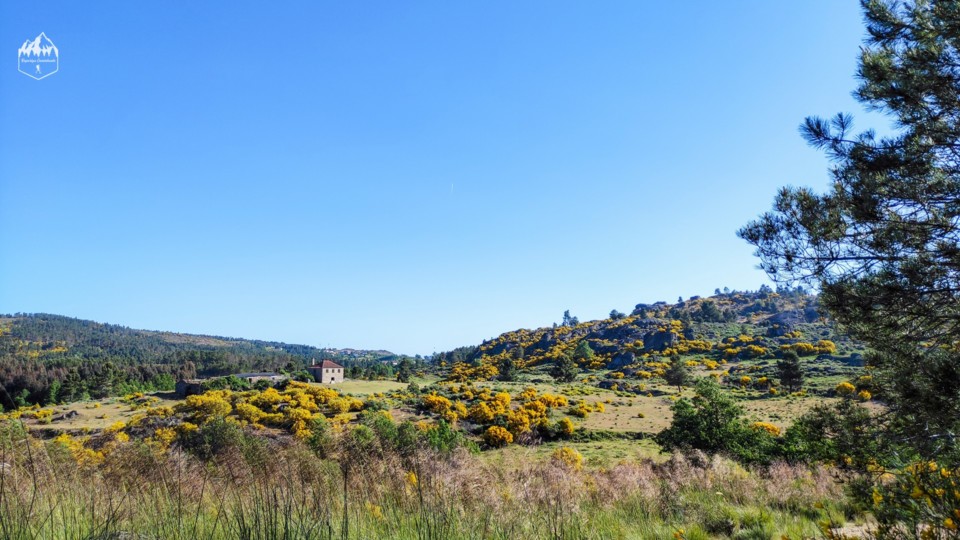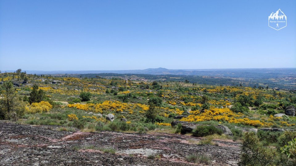 Nesta parte podemos apreciar a paisagem linda da serra misturada com os campos agrícolas e como estamos em maio as giestas estão carregadas de flores amarelas, é um panorama bonito.