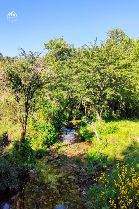Por entre os campos agrícolas e bosques de carvalhos, salgueiros e até castanheiros chegamos então à ribeira onde temos uma bonita paisagem sobre o vale verdejante.