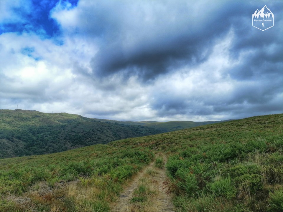 Junto à capela havia uma placa de informação e reparei que dizia "Ruta cortada na ponte entre Queguas (que era para onde íamos) e San Bieito" mas saber se aquilo era recente ou antigo? Arriscamos e seguimos o percurso... por aqui a paisagem era montanhosa sempre com paisagens bonitas e verdejantes e quando olhava para o céu... o tempo está a mudar...espero que não chova (isto já era eu tao frustrada por ter apanhado 5 dias de chuva nestas férias).