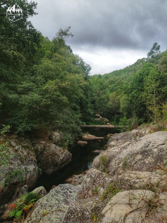 Chegamos a parte mais alta do percurso e agora vamos começar a descer para a linha da água, eu já andava a pensar que a ponte podia estar num sitio alto e não ter passagem mas quando chegamos lá fiquei aliviada, a ponte de madeira ainda lá estava mas com 2 ou 3 tábuas partidas, dava para passar ou então até dá para fazer passagem no rio pois tem umas pedras e é fácil. Entretanto começa a chover bolas ...já chega não?