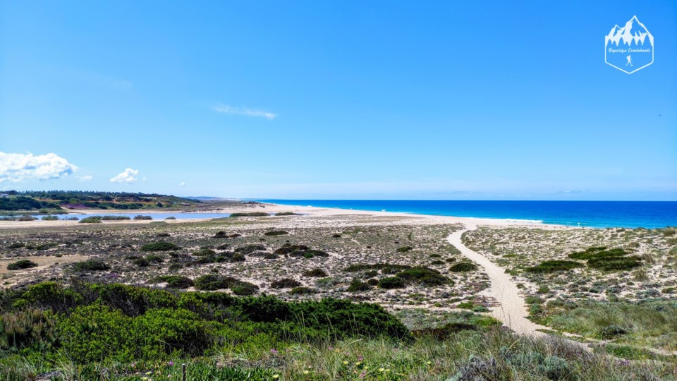 Antes de descermos para a praia temos uma vista muito bonita sobre a lagoa de Melides e da praia de Melides. Agora é caminhar sobre a areia atravessando a praia para chegarmos ao nosso ponto inicial.