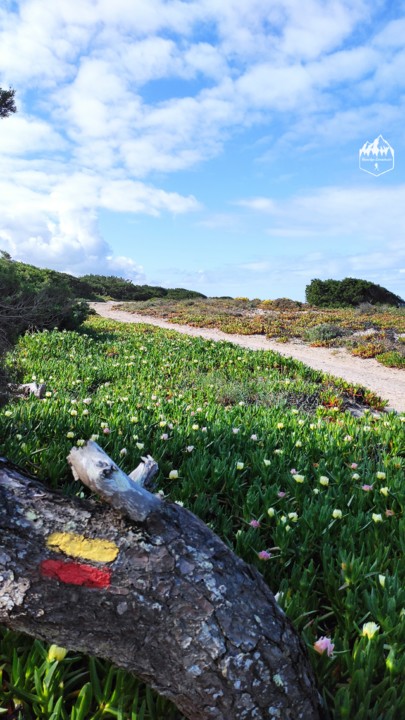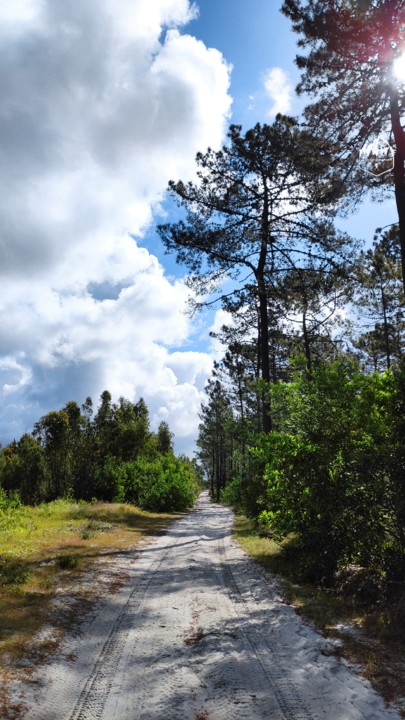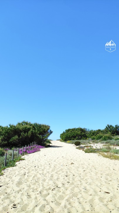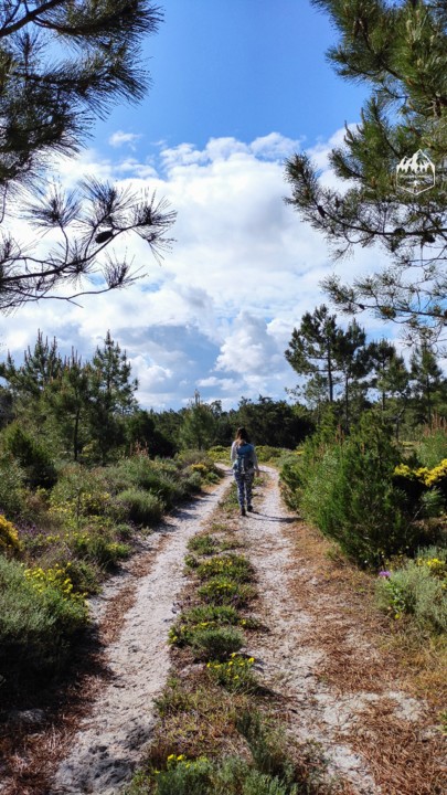 Vamos seguindo um carreio arenoso, o que abranda um pouco o passo, até que depois vamos entrar mais para o interior onde iremos passar por uma zona de pinhal.