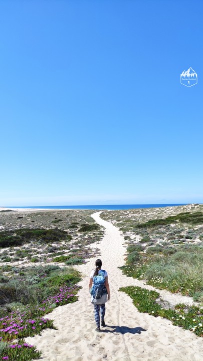 Começando no parque de estacionamento da praia de Melides vamos seguir um estradão paralelo à praia. Inicialmente temos logo a paisagem maravilhosa sobre o mar e até o cheiro a maresia se sente.